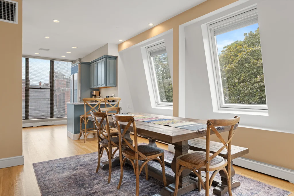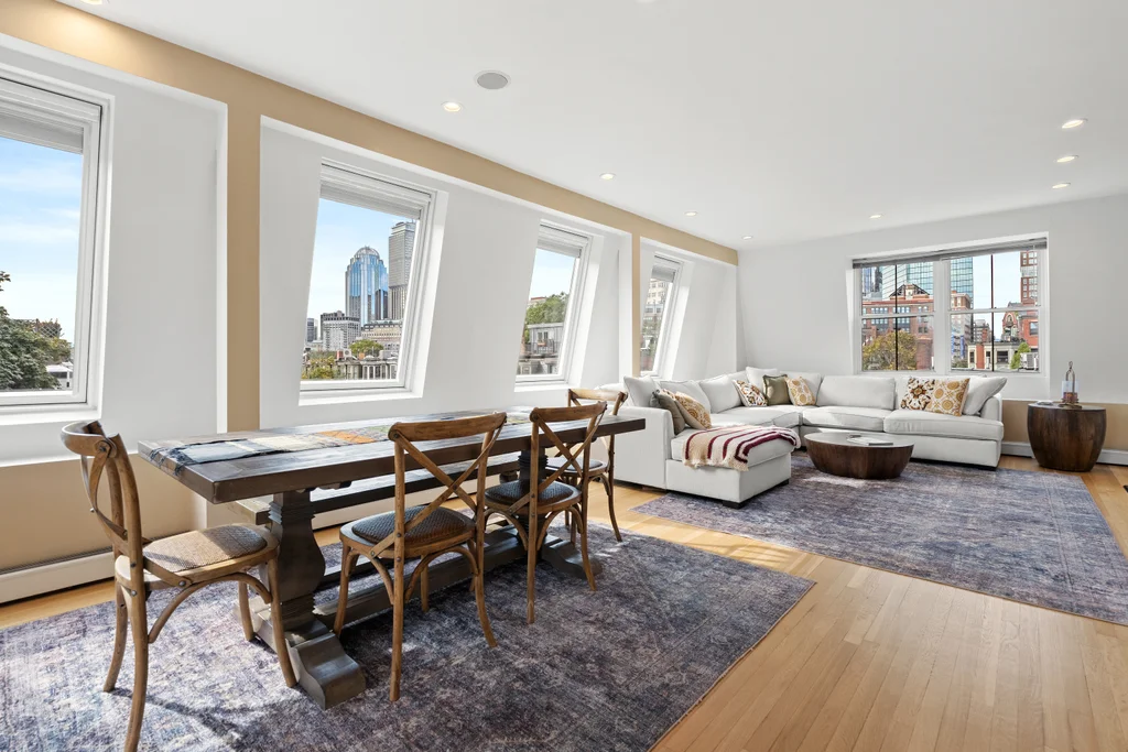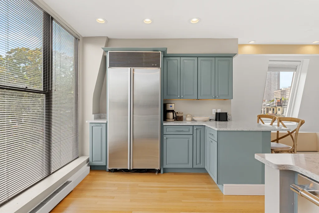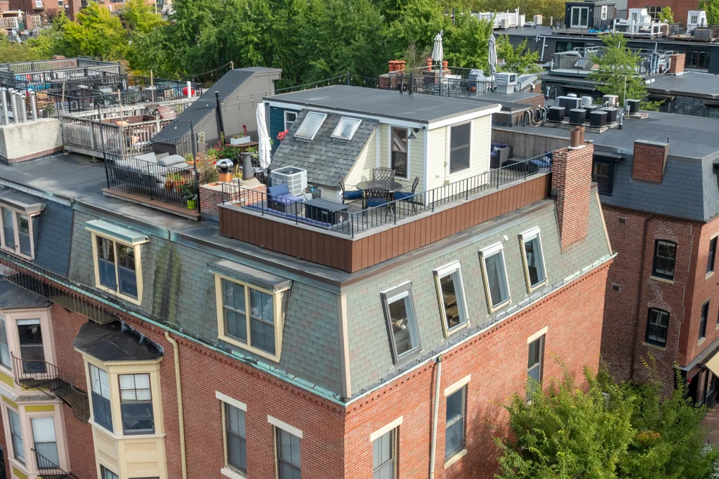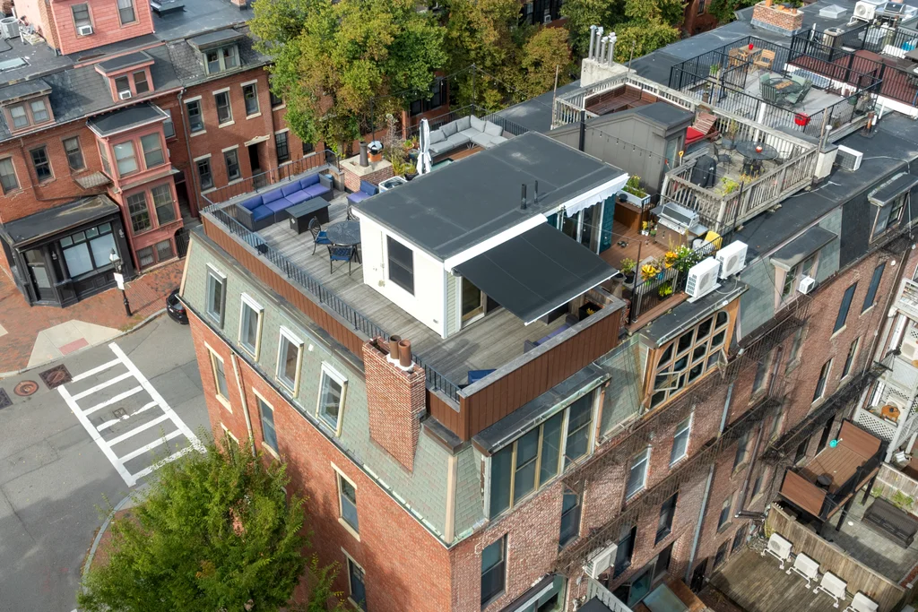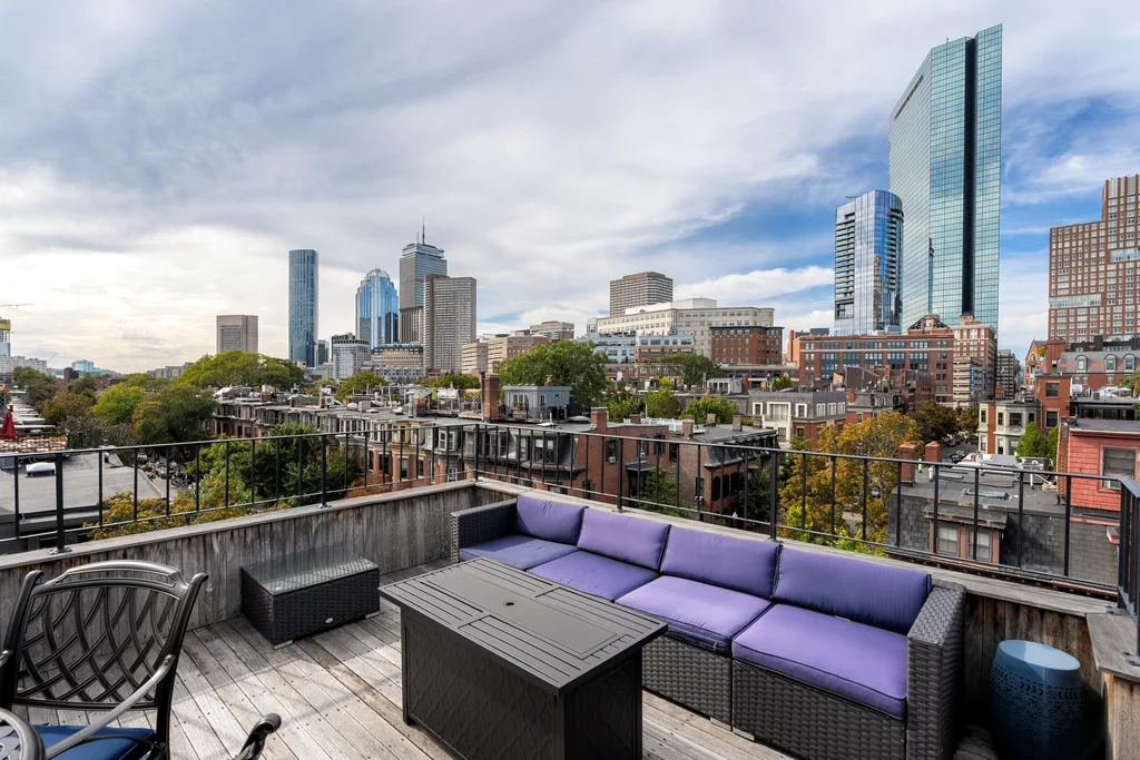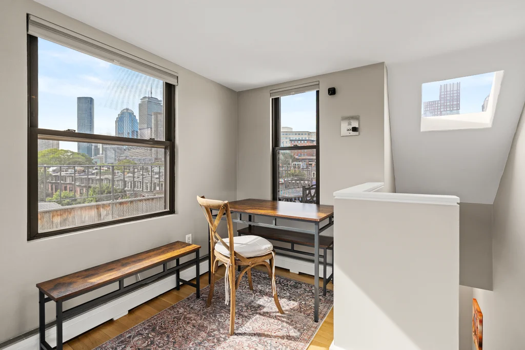 This penthouse duplex offers three exposures providing tremendous light, openness, and soaring city views. The open concept living and dining areas feature six updated windows, built-in shelving, and a wood-burning fireplace with a restored marble mantle. The new kitchen features floor-to-ceiling windows, custom cabinetry, quartz counters, a Thermador gas range, microwave, and dishwasher, a Sub-Zero refrigerator, and a breakfast bar. The primary bedroom has a corner exposure and an exposed brick wall. The second bedroom has built-in shelving, a large closet, and a W/D. Completing this floor is a full bath with a custom vanity, a soaking tub, and a tiled shower. A special feature of this penthouse unit is the head house/ office leading to the oversized private roof deck. Other features include: refinished hardwood floors, new forced air heating and cooling, recessed lighting, and new interior paint. 72-74 Appleton Street is a small, five-unit, professionally managed association located just steps from fine shops, restaurants, rental garage parking, public transportation, and all Boston offers.