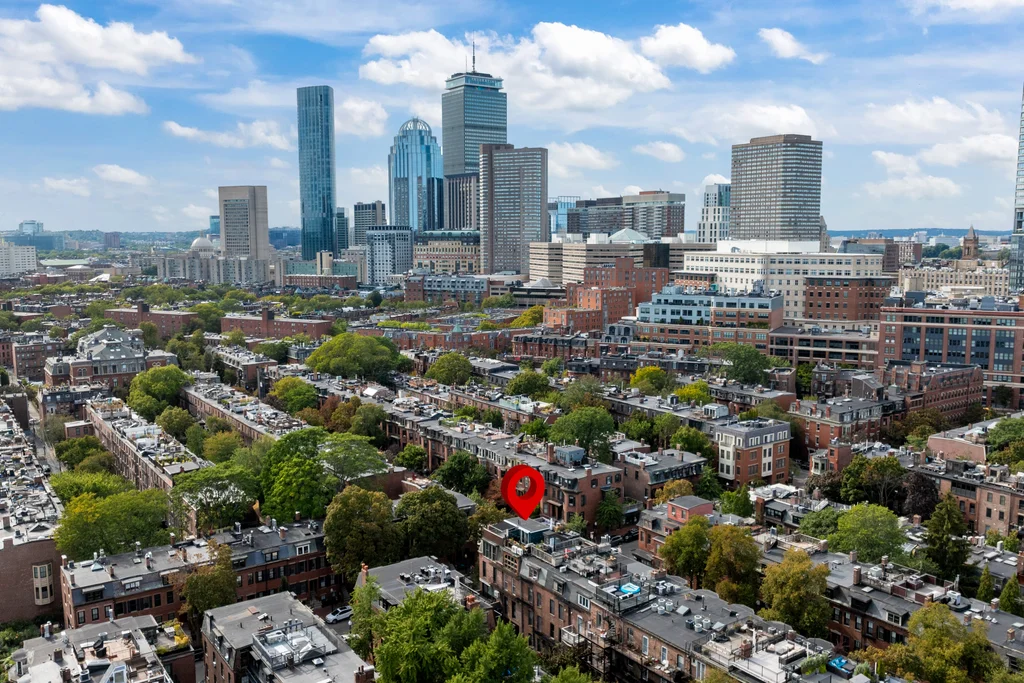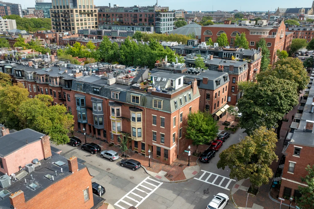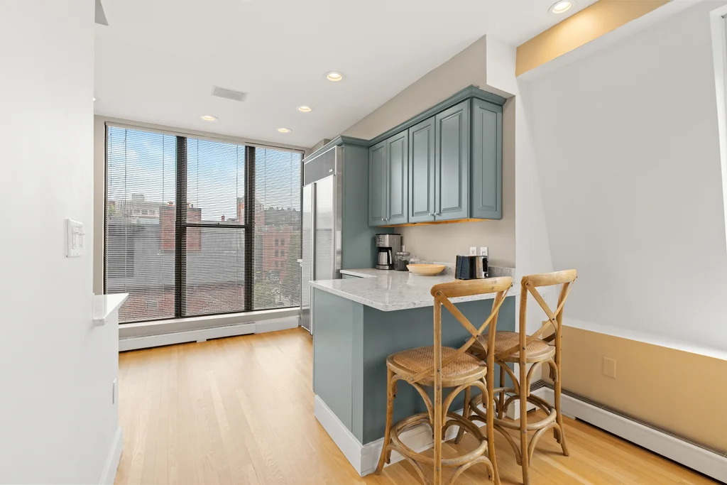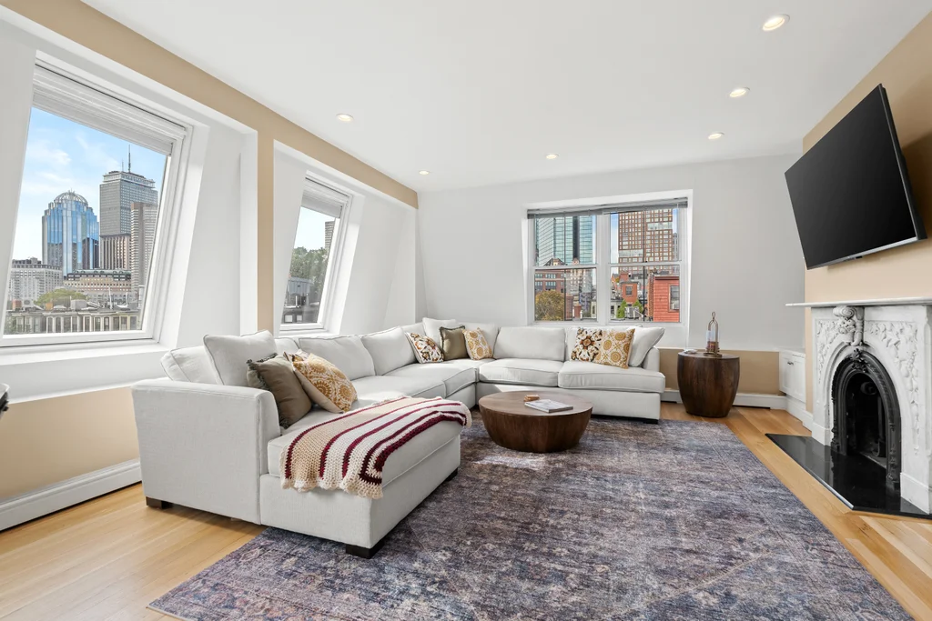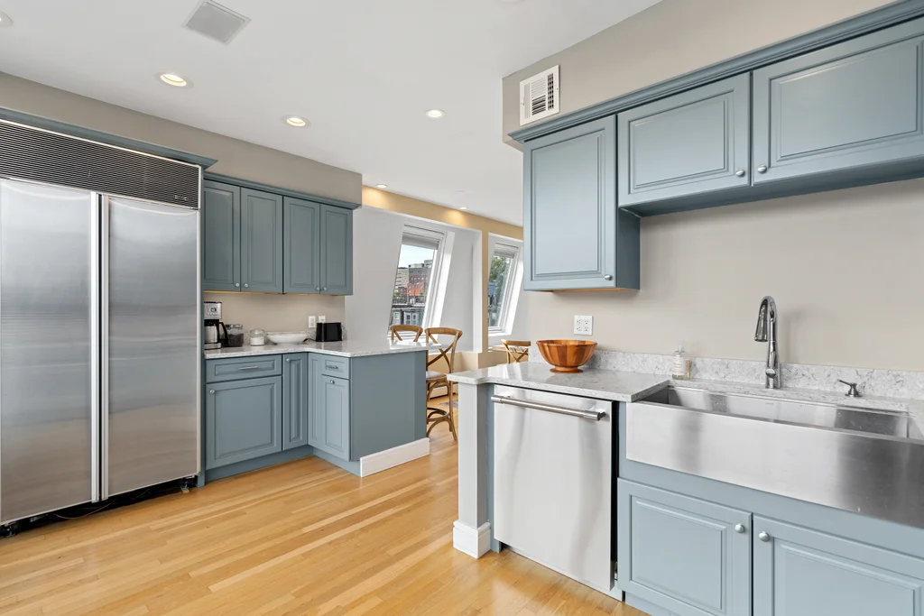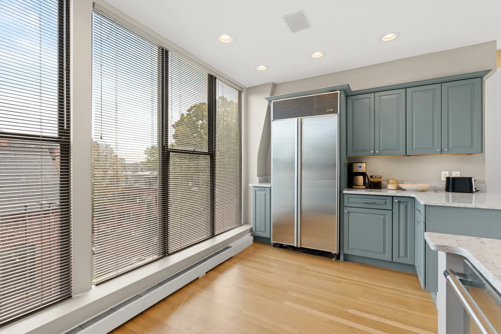 This penthouse duplex offers three exposures providing tremendous light, openness, and soaring city views. The open concept living and dining areas feature six updated windows, built-in shelving, and a wood-burning fireplace with a restored marble mantle. The new kitchen features floor-to-ceiling windows, custom cabinetry, quartz counters, a Thermador gas range, microwave, and dishwasher, a Sub-Zero refrigerator, and a breakfast bar. The primary bedroom has a corner exposure and an exposed brick wall. The second bedroom has built-in shelving, a large closet, and a W/D. Completing this floor is a full bath with a custom vanity, a soaking tub, and a tiled shower. A special feature of this penthouse unit is the head house/ office leading to the oversized private roof deck. Other features include: refinished hardwood floors, new forced air heating and cooling, recessed lighting, and new interior paint. 72-74 Appleton Street is a small, five-unit, professionally managed association located just steps from fine shops, restaurants, rental garage parking, public transportation, and all Boston offers.
