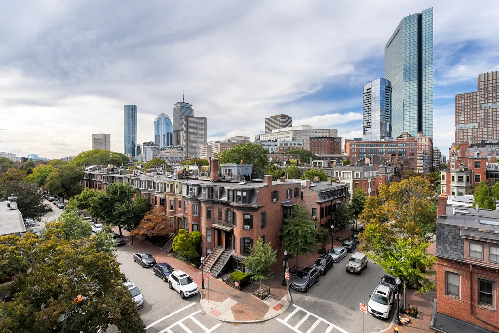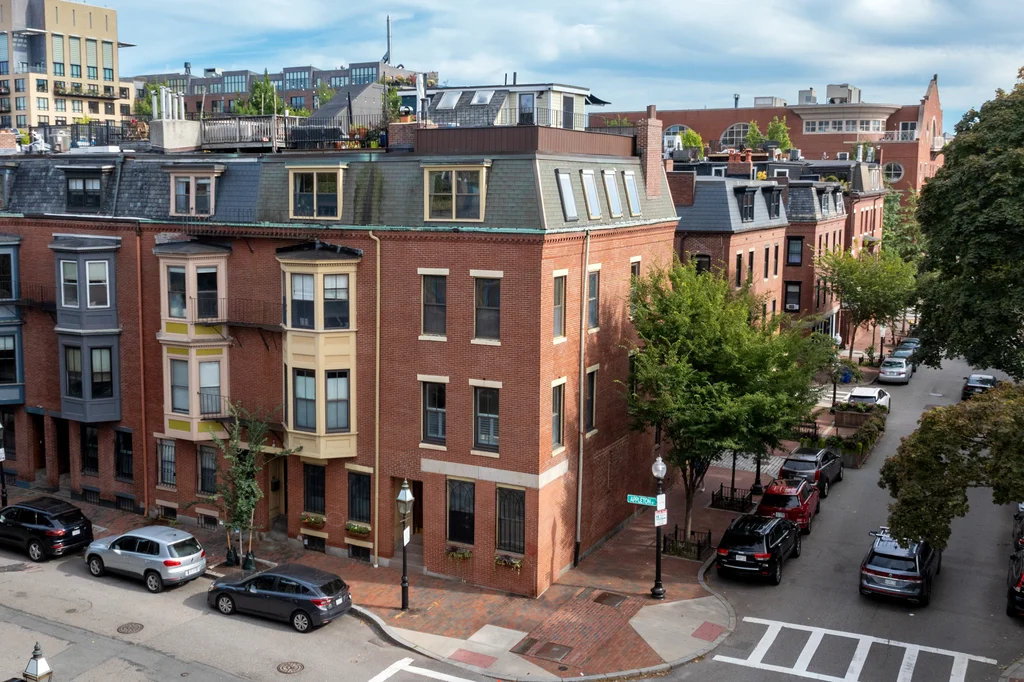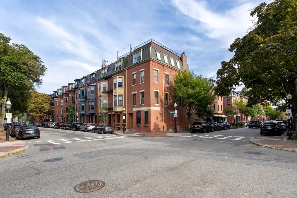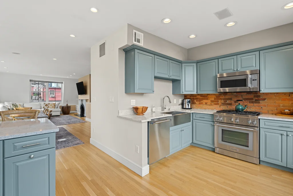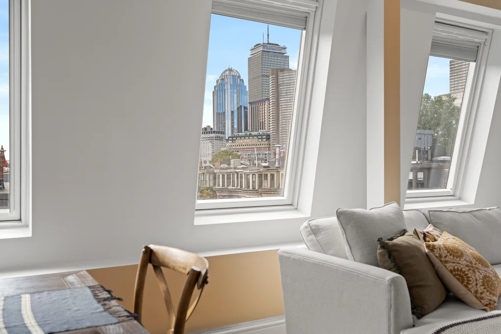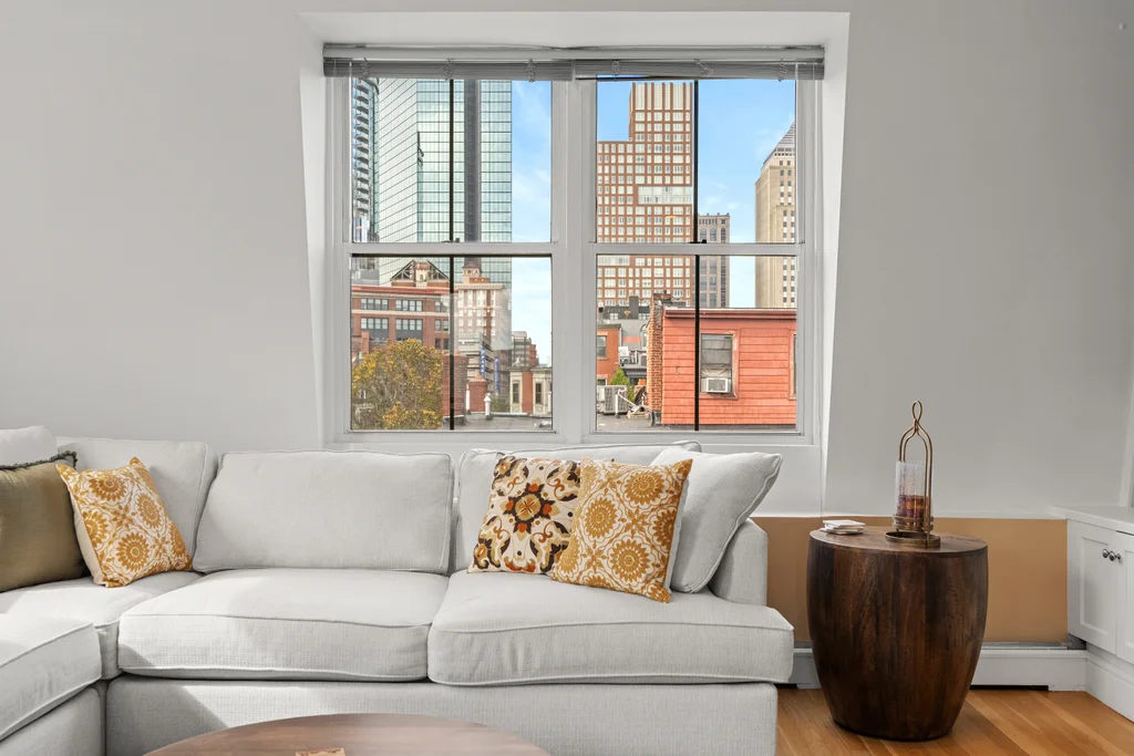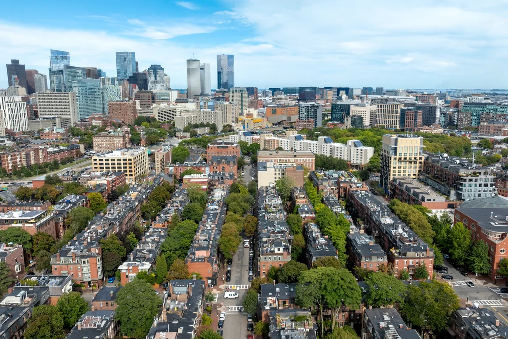 This penthouse duplex offers three exposures providing tremendous light, openness, and soaring city views. The open concept living and dining areas feature six updated windows, built-in shelving, and a wood-burning fireplace with a restored marble mantle. The new kitchen features floor-to-ceiling windows, custom cabinetry, quartz counters, a Thermador gas range, microwave, and dishwasher, a Sub-Zero refrigerator, and a breakfast bar. The primary bedroom has a corner exposure and an exposed brick wall. The second bedroom has built-in shelving, a large closet, and a W/D. Completing this floor is a full bath with a custom vanity, a soaking tub, and a tiled shower. A special feature of this penthouse unit is the head house/ office leading to the oversized private roof deck. Other features include: refinished hardwood floors, new forced air heating and cooling, recessed lighting, and new interior paint. 72-74 Appleton Street is a small, five-unit, professionally managed association located just steps from fine shops, restaurants, rental garage parking, public transportation, and all Boston offers.